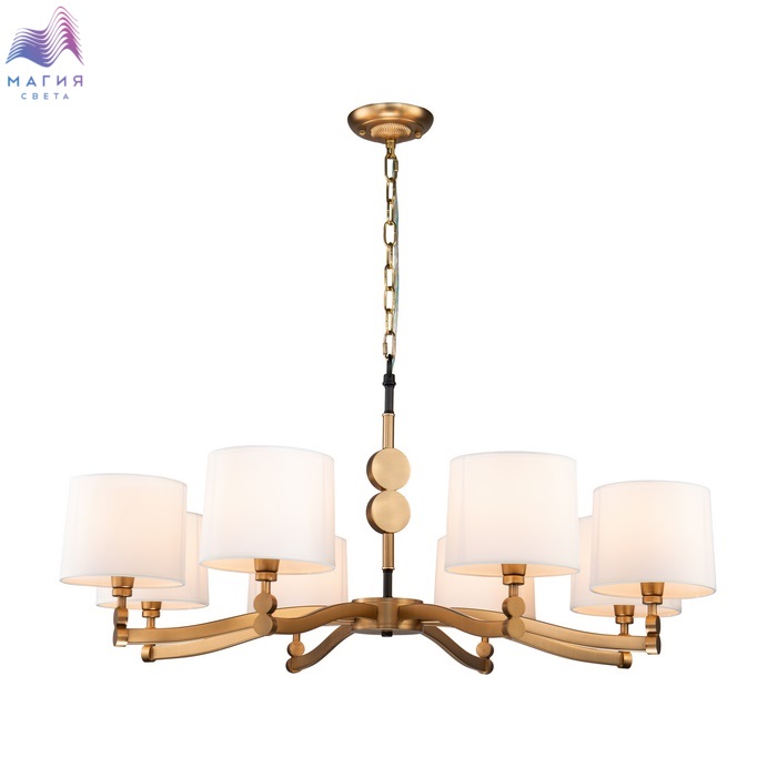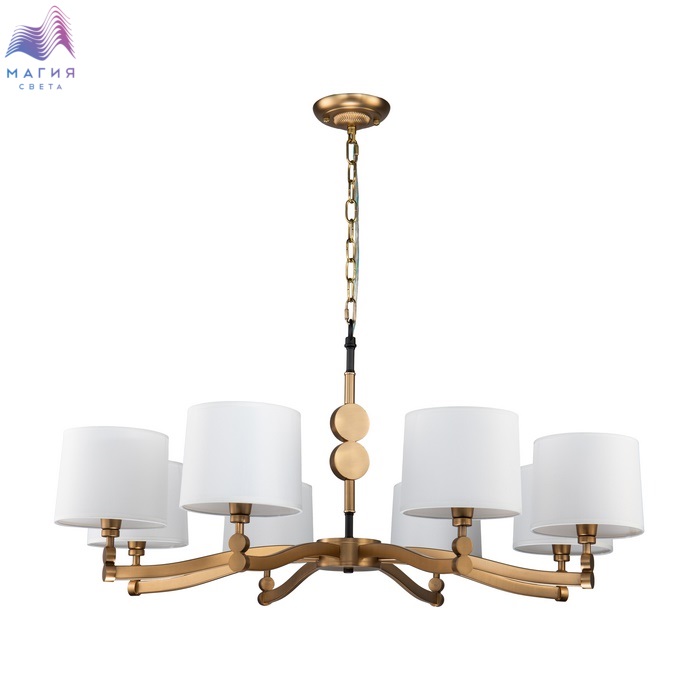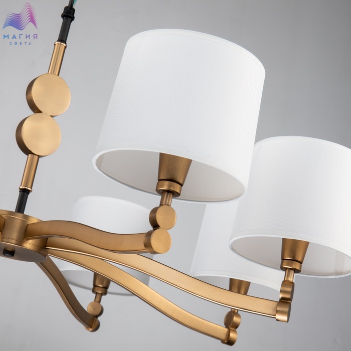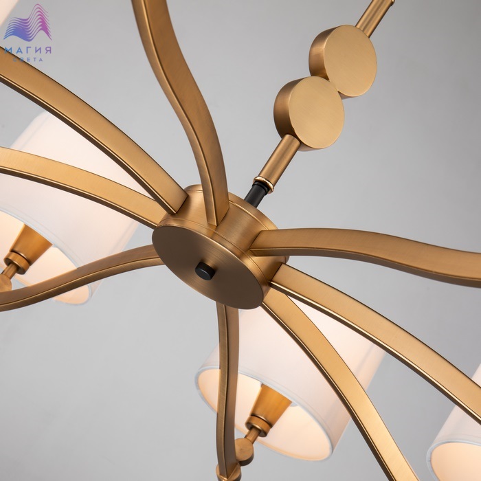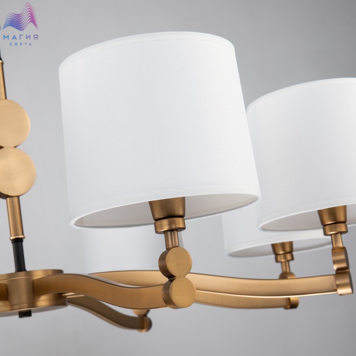 Уютная коллекция Favourite Roshe выполнена из матовой латуни. Украшением коллекции являются декоративные элементы, напоминающие монетки. Они повторяются на рожках и центральном штоке. Плафоны изготовлены из белого шелка.
