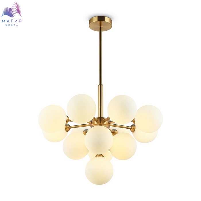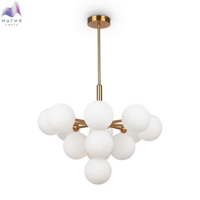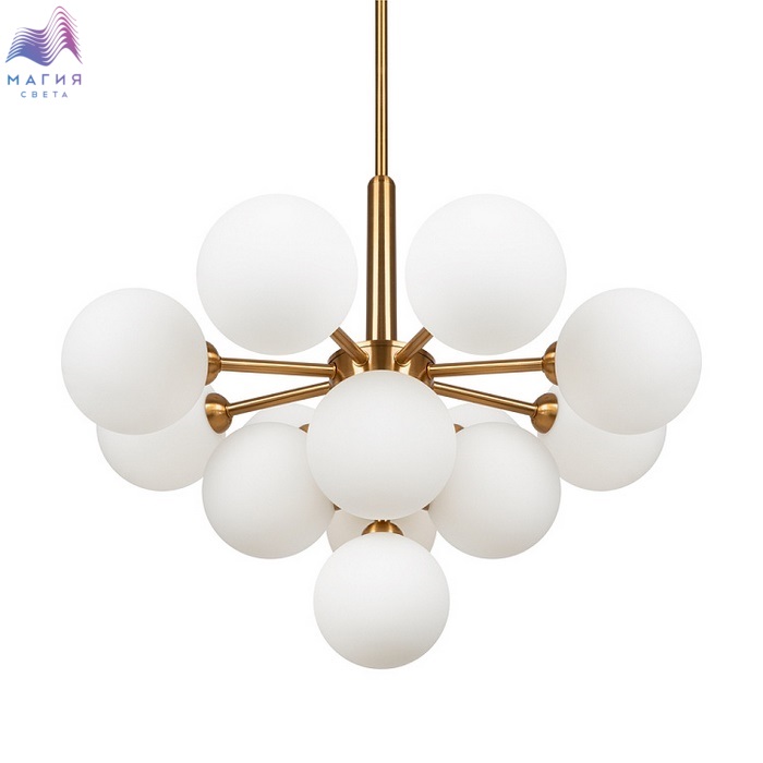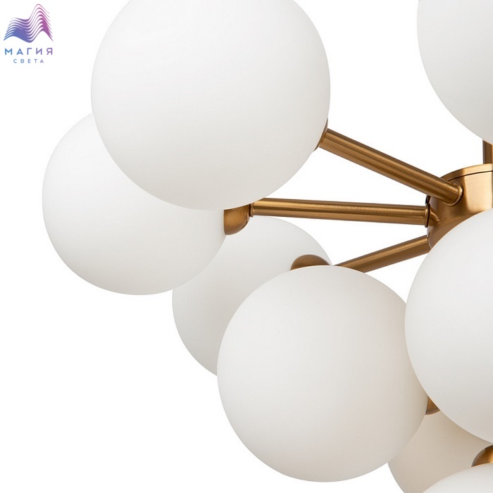 Округлые плавные линии и трендовые плафоны-сферы – беспроигрышное сочетание для современных интерьеров. Металлическая арматура светильника выполнена в актуальном оттенке латуни. Аскетичный силуэт подчеркнут шаровидными плафонами из матового белого стекла. Серия Freya Inversion включает люстру на 13 плафонов, бра и настольную лампу. Ассортимент подходит для общей и зональной подсветки, а при желании – легко комбинируется с любыми моделями, оснащенными сферическими плафонами.