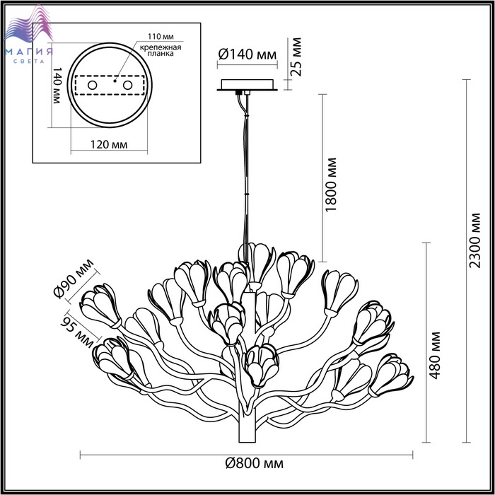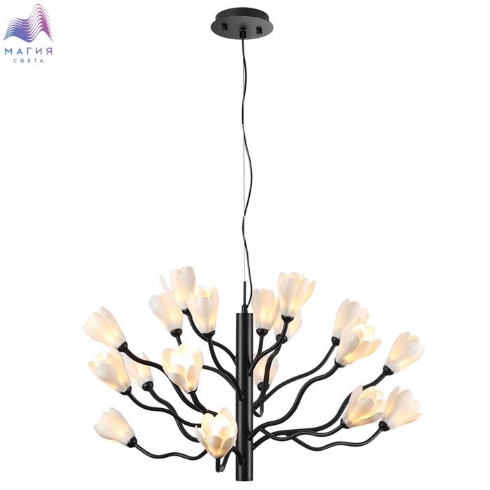 Коллекция Odeon light Gardi похожи на цветущую магнолию. Плафоны в виде белых цветов выполнены из светопропускающего фарфора. Арматура окрашена в матовый черный цвет.