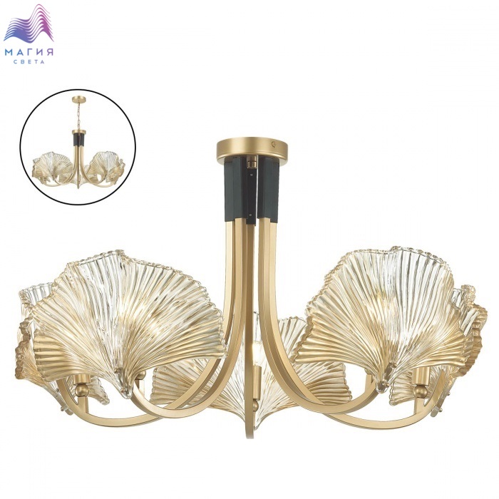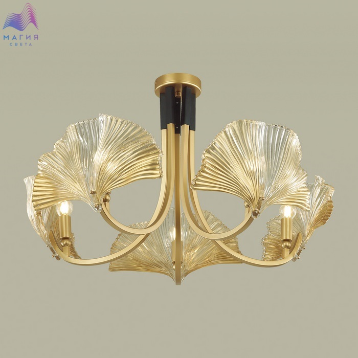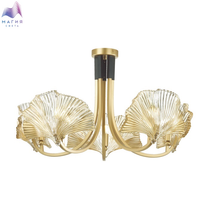 Коллекция Odeon light exclusive Ventaglio полностью оправдывает свое название. Слово "ventaglio" с итальянского переводится как веер. Плафон представляет собой листок гибкого билоба, который распахнут, словно данный аксессуар. Металлический каркас окрашен в черный и золотой цвета, которые гармонично сочетаются со стеклянными пластинами.