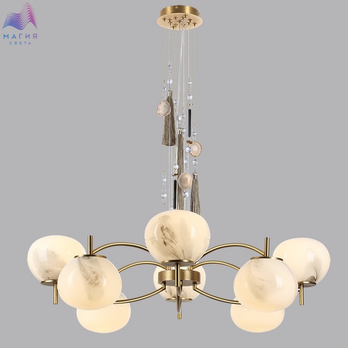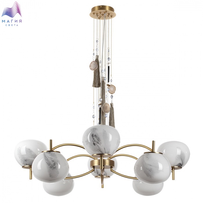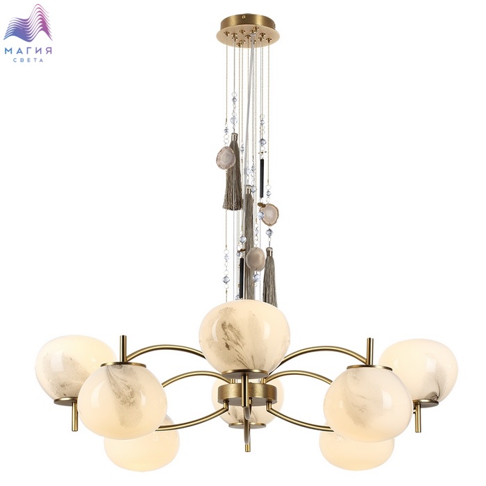 Нежная коллекция Odeon light exclusive Fiolent исполнена в стиле неоклассика. Главным декоративным элементом является струящаяся кисть и натуральный агат. Плафон изготовлен из стекла, напоминающего мраморные узоры.