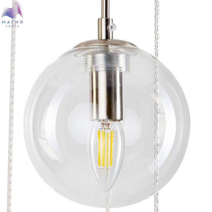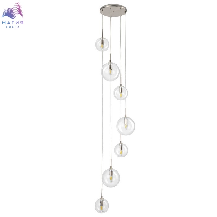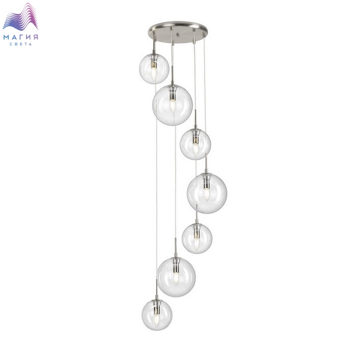 Подвесной светильник Citilux Томми CL102071. Материал: металл/стекло. Цвет: матовый хром/прозрачный. Основание светильника круглой формы. Подвесная спираль каскада сформирована плафонами двух размеров, диаметром 15см и 20см. Плафоны в форме шара.