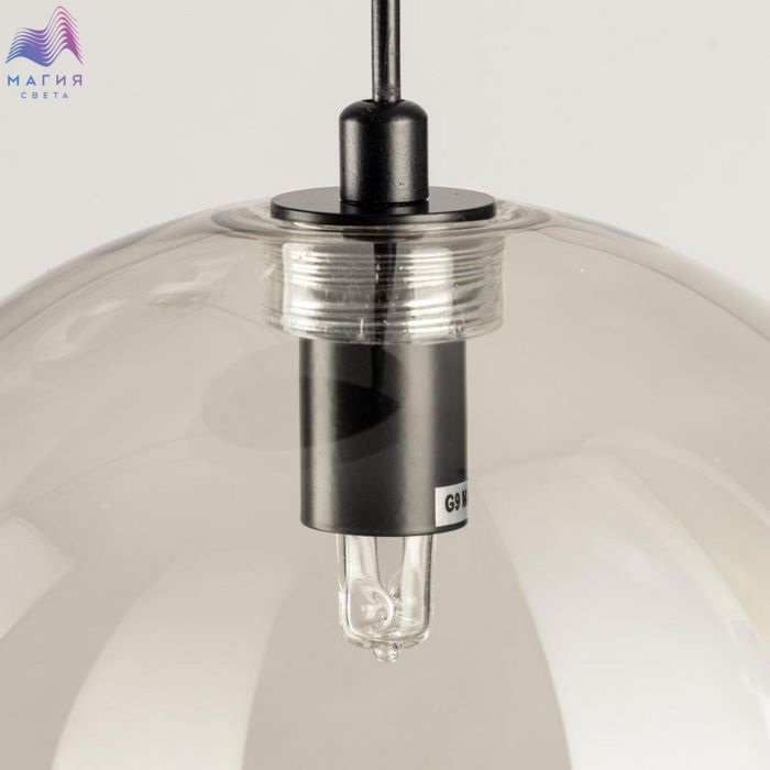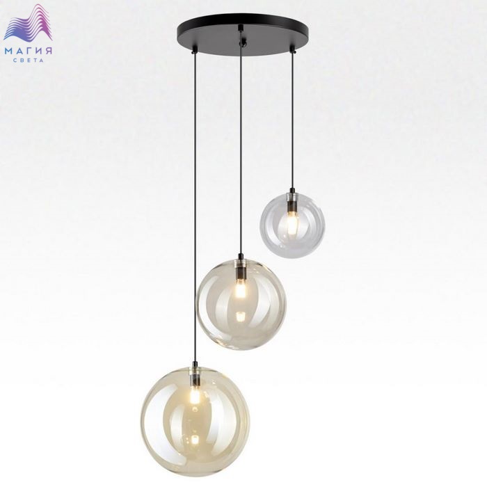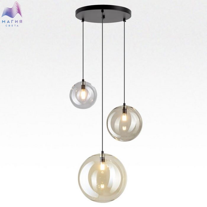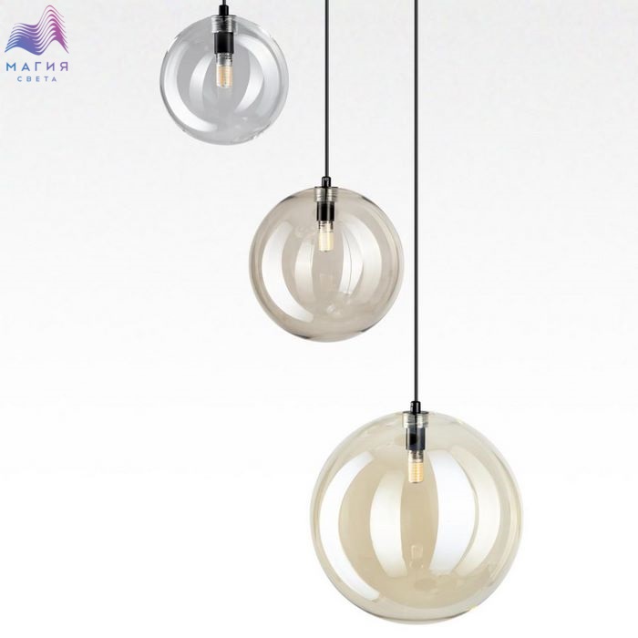 Подвесной светильник Citilux ORTON CL202133. Материал: металл/стекло. Цвет: черный/шампань/дымчатый. Плафон в форме шара. Прозрачные, с золотистым оттенком шампань и дымчатые плафоны (размером 15, 20 и 25см) превращают люстру в художественный элемент даже при выключенном свете.