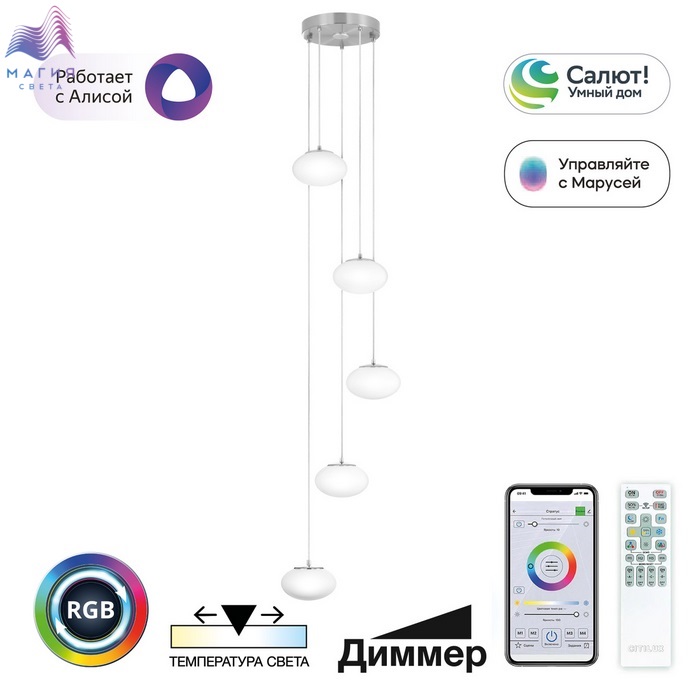 Серия потолочных люстр Citilux Atman. Корпус металлический, цвет: бронза и матовый хром. Эллиптические плафоны из оптического полимера. Можно включить либо основной свет, либо RGB. Управление с помощью пульта ДУ, умную колонку, смартфона, настенного выключателя.