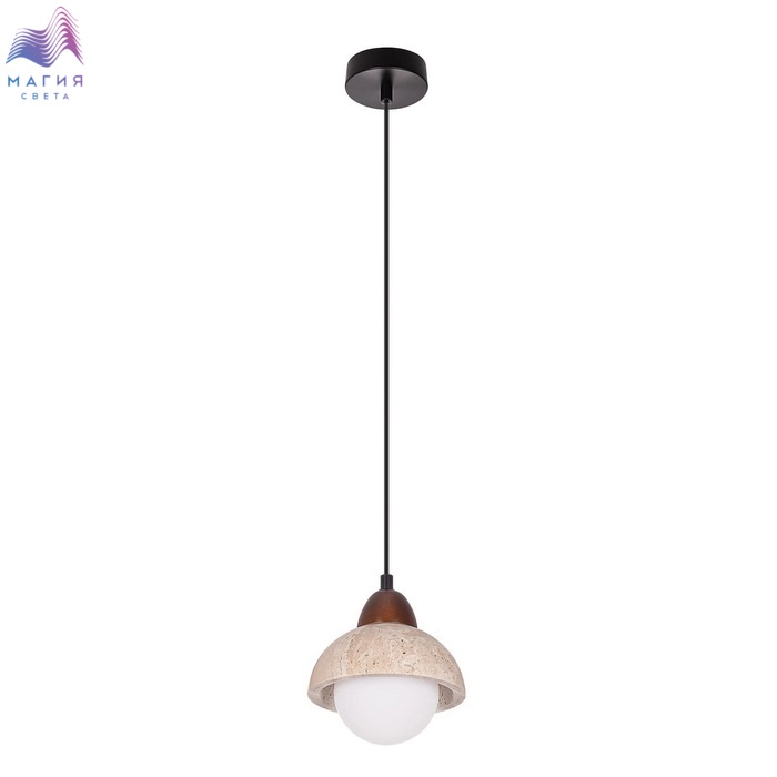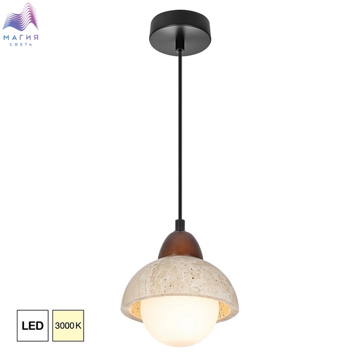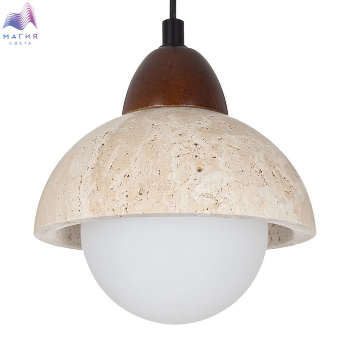 Светодиодный подвесной светильник Citilux Mares CL246017. Материал: металл/травертин/полимер. Цвет: черный/бежевый/белый. Плафон имеет двойную конструкцию: внешняя полусфера из натурального камня травертина, внутренний плафон в форме шара из матового оптического полимера, дополнительный декоративный элемент из дерева кофейного оттенка.