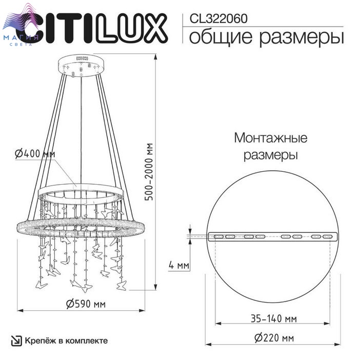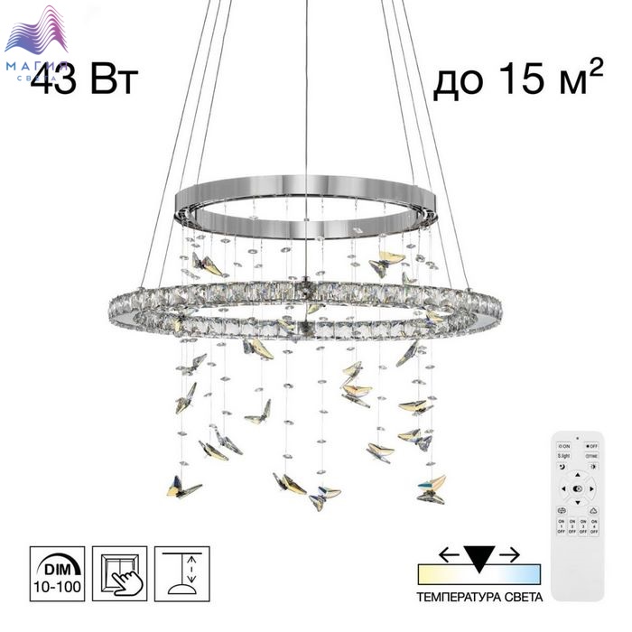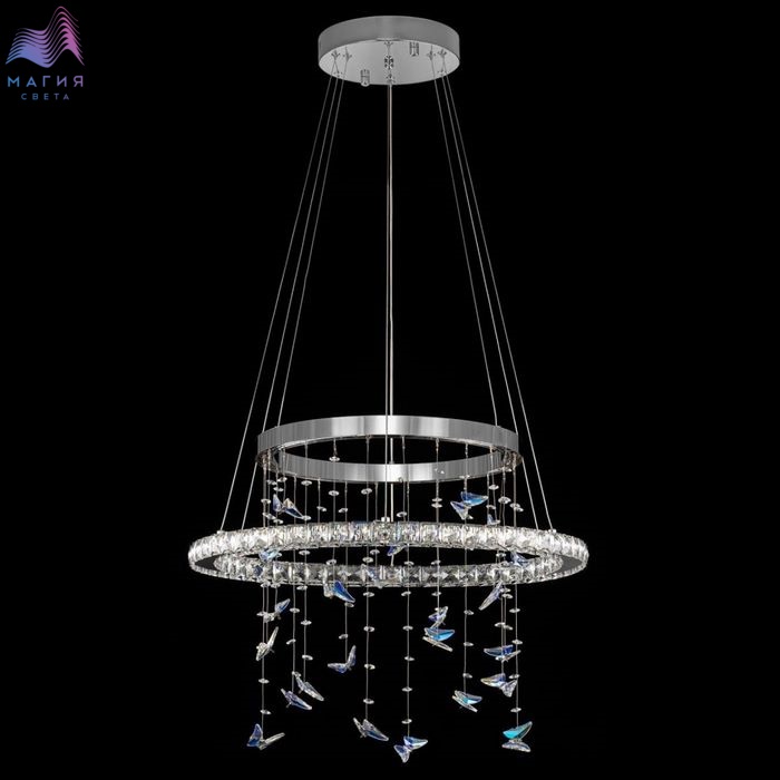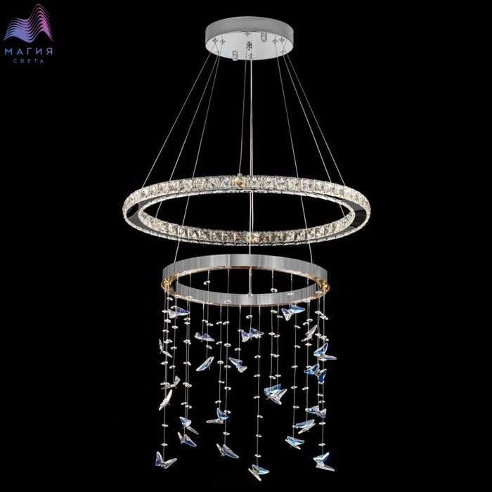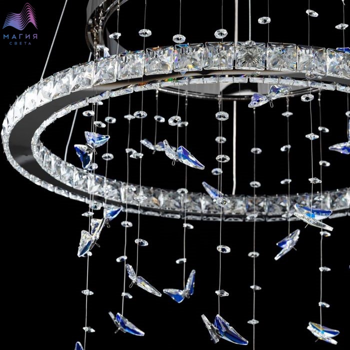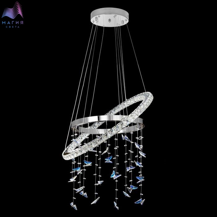 Светодиодная каскадная люстра Citilux ETERA CL322060. Материал: металл/хрусталь. Цвет: хром/прозрачный/синий. 2 подвесных колец, ограненных прозрачным хрусталем, дополнены изящными подвесками в форме бабочек отливают глубокой синевой. Пульт ДУ (плавная смена яркости от мягкого свечения (10%) до яркого дневного света (100%), выберите оттенок — от тёплого золотистого (3000K) до холодного кристально-белого (5500K).
