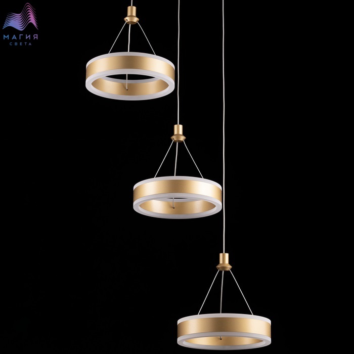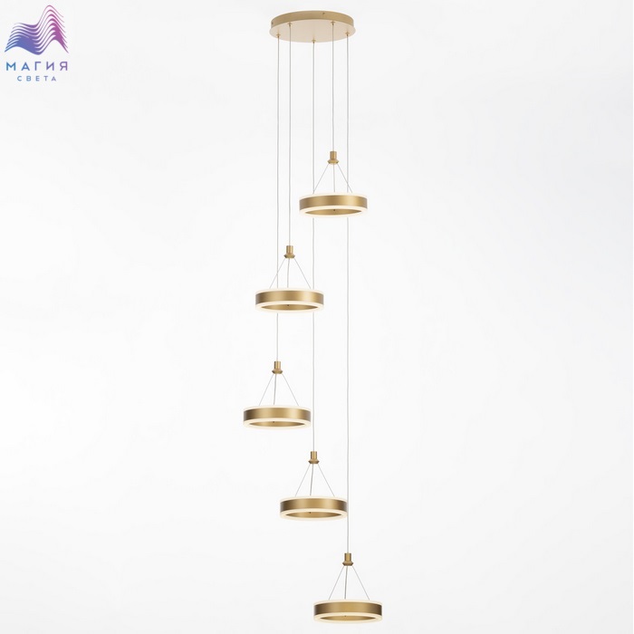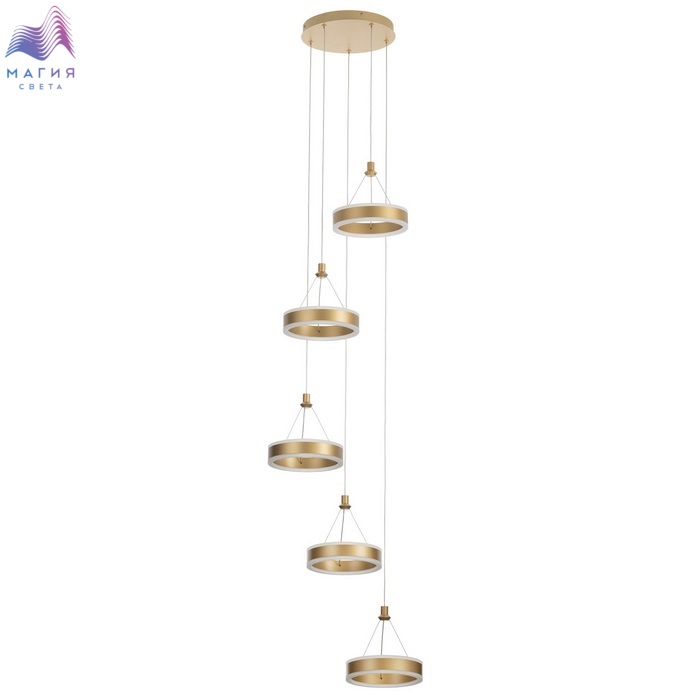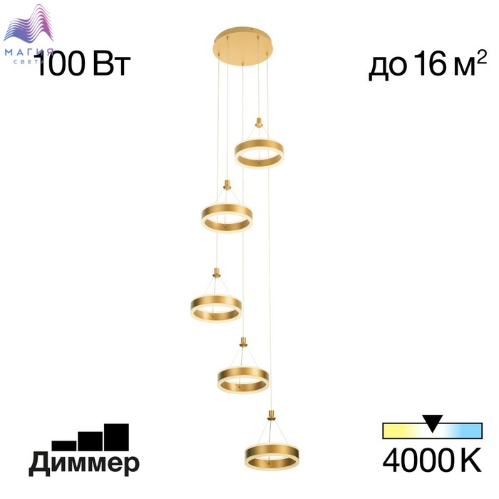 Каскадный светильник Citilux Дуэт CL719052 выполнен в современном стиле. Материал: металл. Цвет: благородное золото. Светильник состоит из круглого основания и пяти подвесных колец. Изделие оснащено встроенным ступенчатым диммером, три уровня яркости – 100-40-15%, управляется обычным настенным выключателем. Цветовая температура 4000К - нейтральный белый свет.