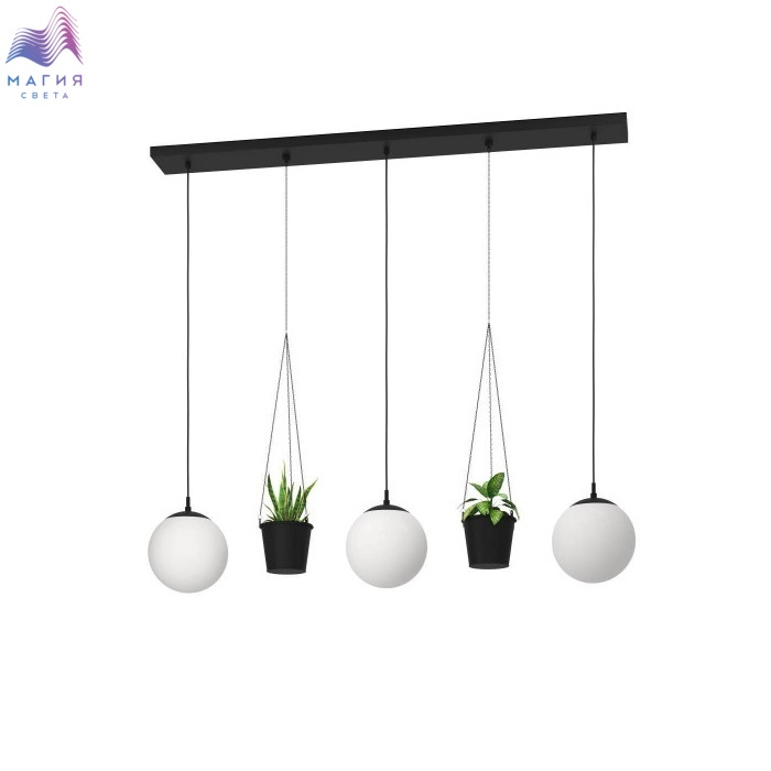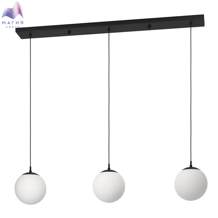 Светильники с плафонами-шарами - тренд 2023 года. Серия Eglo Rondo как раз представлена подвесными моделями с сферическими абажурами. Арматура окрашена в черный цвет.