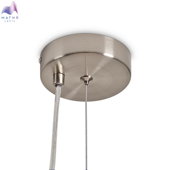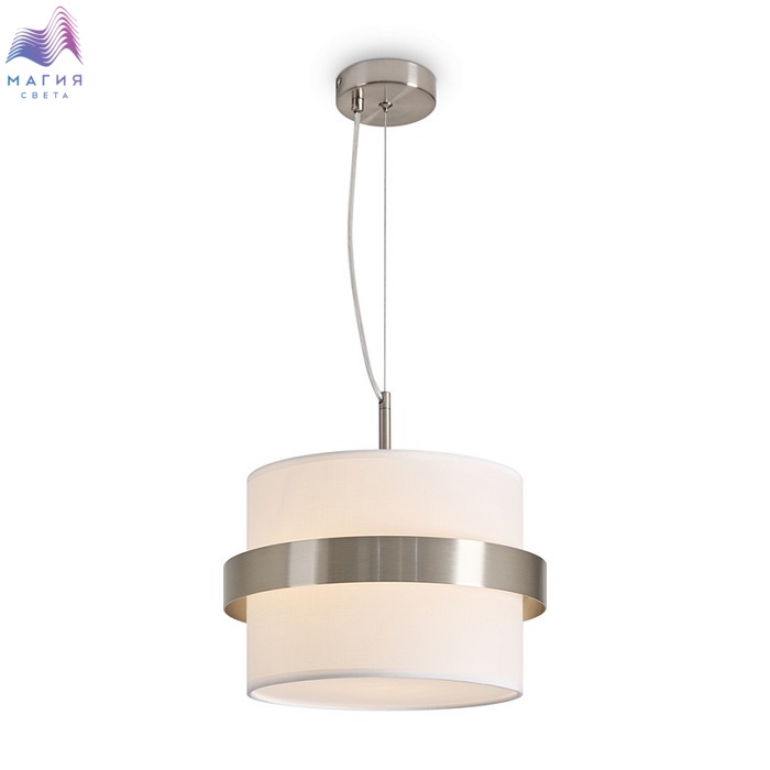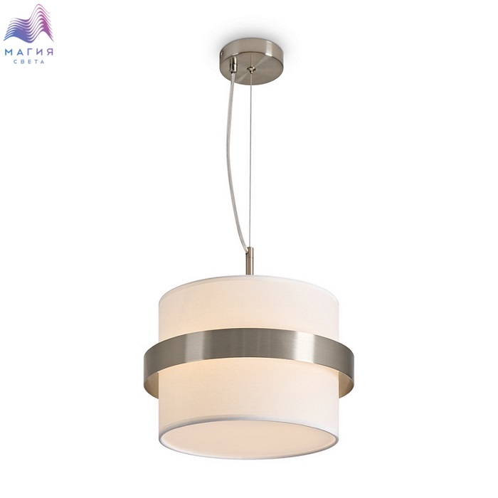 Серия Freya Bride. Металлическая арматура, цвет - латунь или никель. Круглый широкий праздничный абажур из ткани белого цвета. Декоративная парящая окантовка из металла в цвет арматуры. Регулируется по длине. Компактные размеры подходят для низких потолков и небольших интерьеров. Источник света — лампа с цоколем Е14.