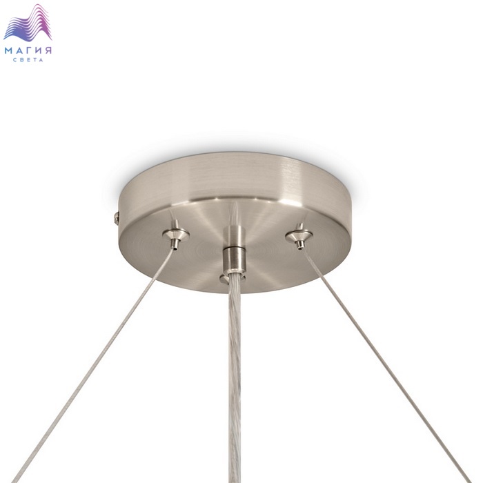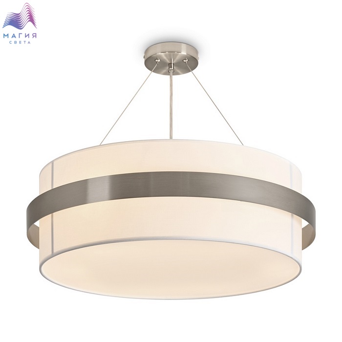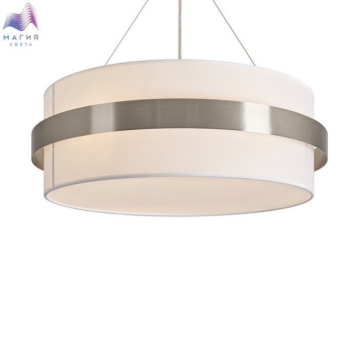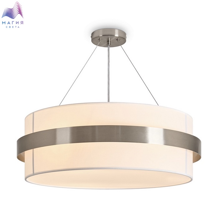 Серия Freya Bride. Металлическая арматура, цвет - латунь или никель. Круглый широкий праздничный абажур из ткани белого цвета. Декоративная парящая окантовка из металла в цвет арматуры. Регулируется по длине. Компактные размеры подходят для низких потолков и небольших интерьеров. Источник света — лампа с цоколем Е14.