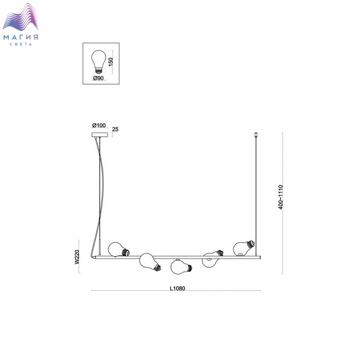 Коллекция Freya Evidence. Металлическая арматура цвета — чёрный или латунь. Прозрачные плафоны-лампочки из стекла в тон арматуры хаотично “разбросаны” по острову светильника. Подвесы регулируются по высоте. Источник света — лампа с цоколем G9.