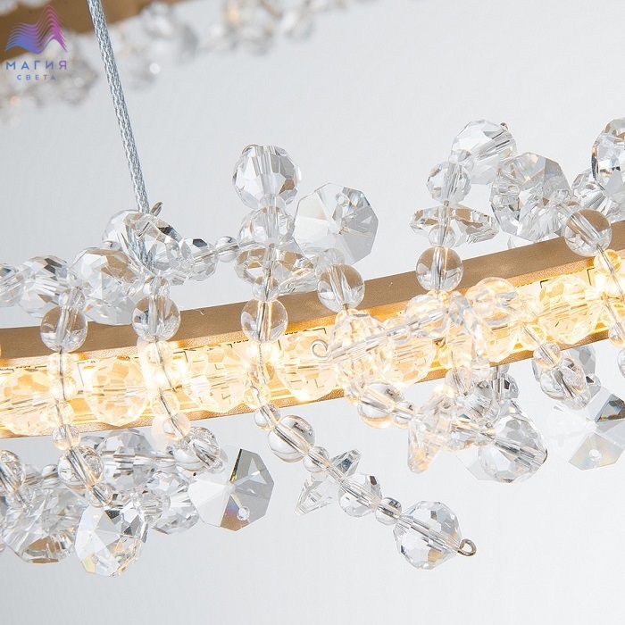 Подвесные светильники Kink Light Лауралюкс отличаются роскошным дизайном. Металлические кольца покрыты латунной краской. Каркас декорирован прозрачными хрустальными элементами. Цвет свечения - теплый белый.