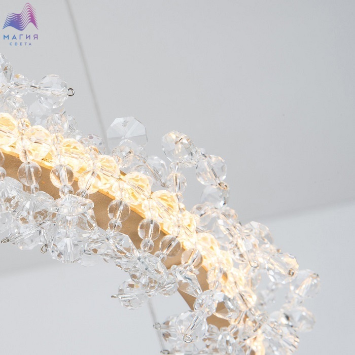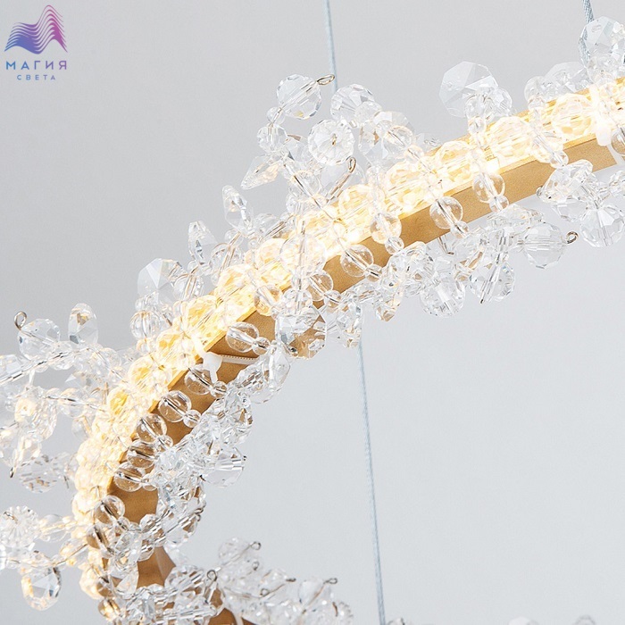 Подвесные светильники Kink Light Лаура отличаются роскошным дизайном. Металлические кольца покрыты латунной краской. Каркас декорирован прозрачными хрустальными элементами. Цвет свечения - теплый белый.