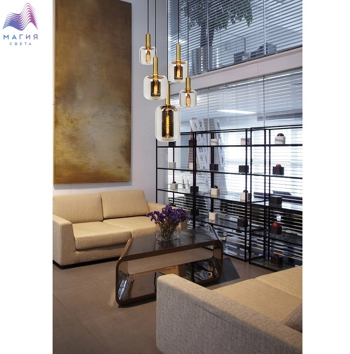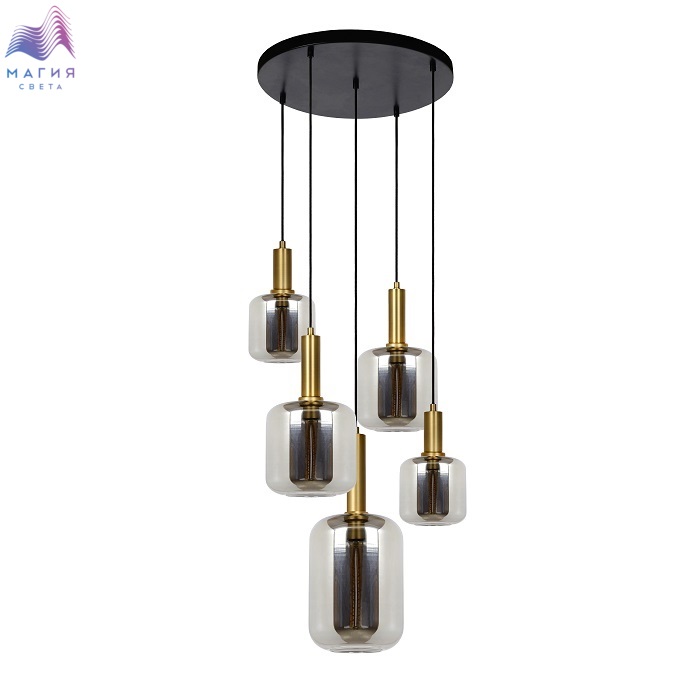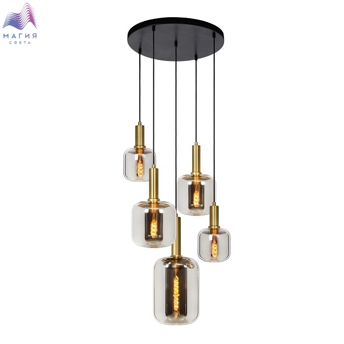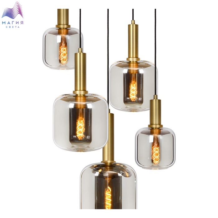 Элегантная коллекция Lucide Joanet представлена подвесными светильниками на 1, 5 и 6 плафонов. Абажуры изготовлены из дымчатого стекла и дополнены металлической латунной деталью. Каскадные светильники из этой серии можно использовать для освещения лестницы или объемного пространства. Длину проводов можно отрегулировать при монтаже.