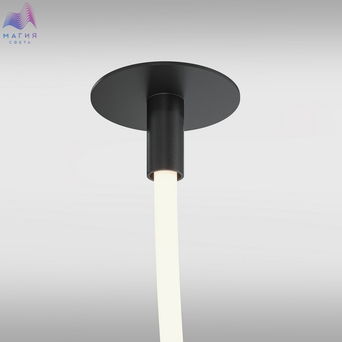 Серия Maytoni Tau привлекает внимание благодаря силиконовому шнуру, в котором расположены светодиоды. Коллекция состоит из подвесных моделей, бра и торшера. Металлическая конструкция покрыта черной или золотой краской. Длину проводов можно отрегулировать при установке.