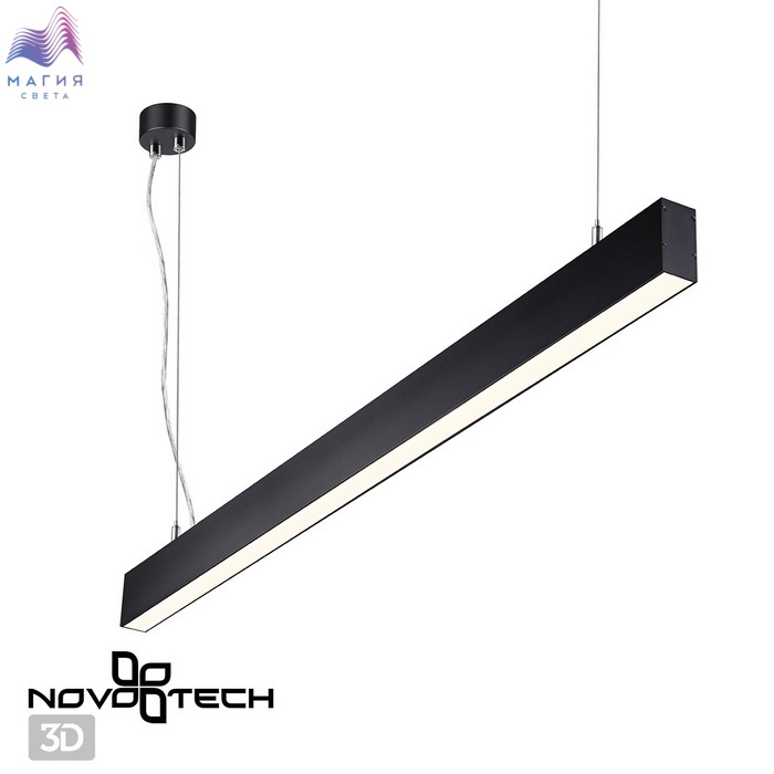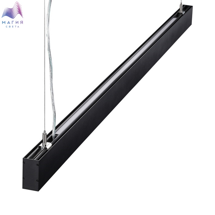 Линейные подвесные светодиодные светильники ITER. Удобное решение – купил и установил. Модельный ряд представлен: в двух размерах (Д)903 мм и (Д)1203мм, в двух классических цветах чёрном и белом. Способ установки только подвесной (подвесы в комплекте), потому что светильник светит вверх (12Вт) и вниз (40Вт). Драйвер электропитания размещается внутри светильника.