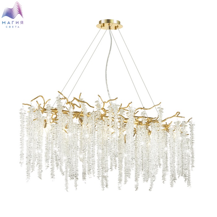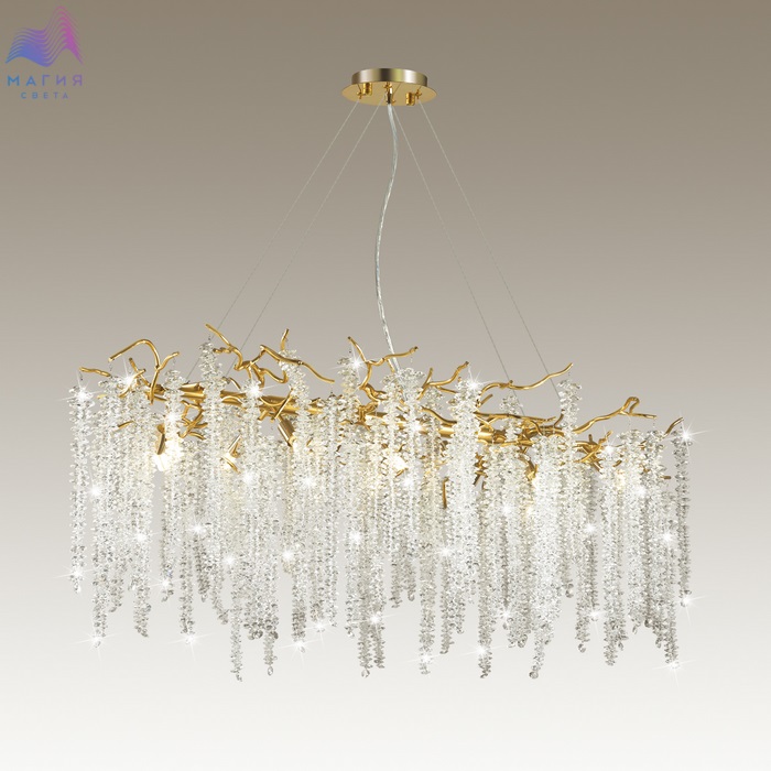Серия Odeon light Banche — это природные мотивы, изящество линий и многообразие форм, выраженных в моделях люстр и настенных светильников. Множество свисающих подвесок из плотно нанизанных переливающихся хрустальных бусин, словно «сережки» на изогнутых ветвях плакучей ивы. Арматура в золотом цвете выполнена из алюминия. Аккуратная точечная сварка фиксирует соединения. Ручным способом можно формировать «крону» люстр и бра, подгибая и выпрямляя ветви. В линии есть потолочная и подвесная круглые люстры, овальная люстра и бра. Популярная сейчас овальной формы модель предназначена для размещения над обеденной зоной.