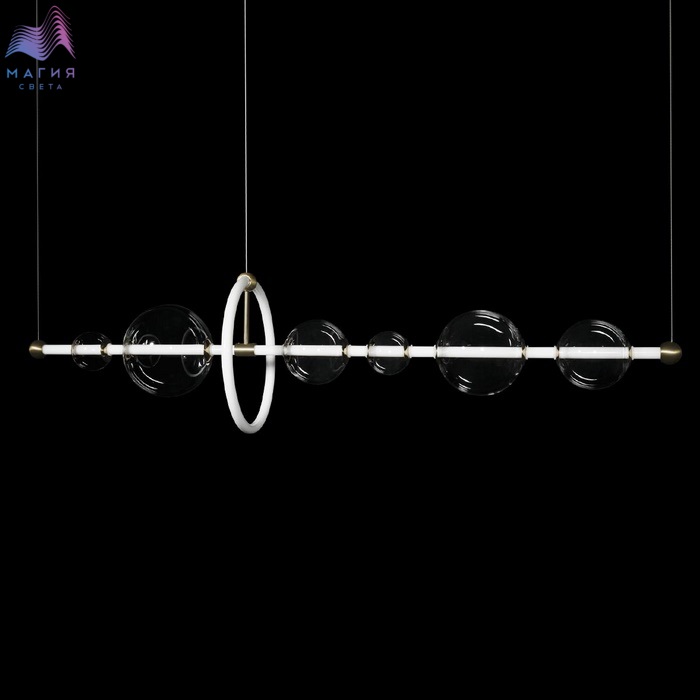 Серия LOFT IT Alpha - современная коллекция, представленная подвесными моделями необычной конструкции. Металлические части окрашены в золотой цвет. Плафон состоит из двух частей: акриловой (светящейся) и стеклянных шаров. Длину проводов можно отрегулировать при монтаже.
