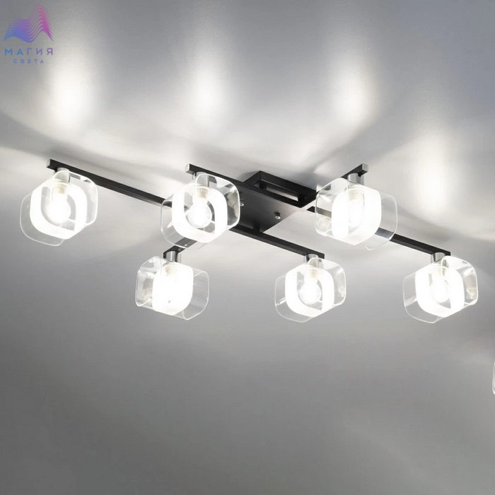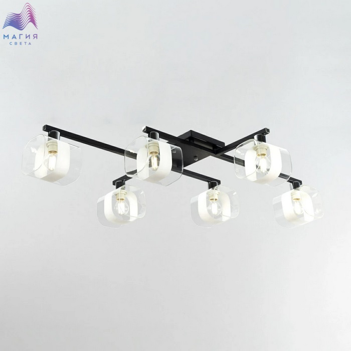 Потолочная люстра в современном стиле Citilux Вирта CL139165. Основание - металл, цвет - черный/хром. Плафон - стекло, цвет - прозрачный/белый. Модель подходит для всех типов потолков, в том числе натяжных. Тип крепления – планка.