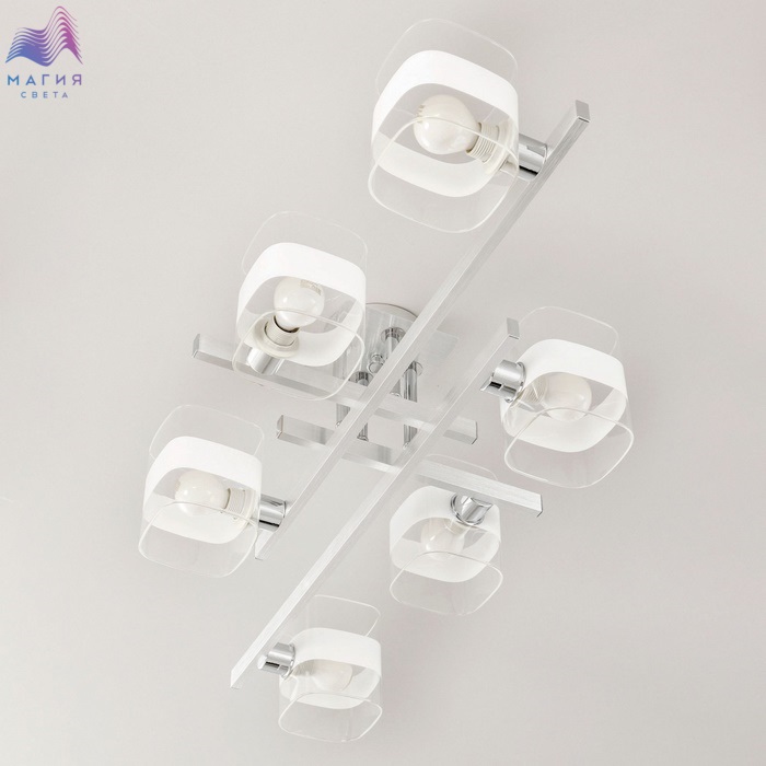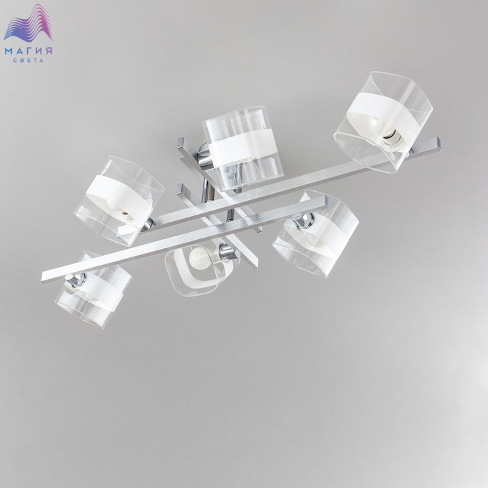 Потолочная люстра Citilux Вирта CL139260 в современном стиле. Корпус - металл, цвет - алюминий/хром. Плафоны - стекло, цвет - прозрачный/белый. Подходит для всех типов потолков, в том числе натяжных. Люстра шестирёхрожковая, вытянутой формы, размер 86х40см, высота 20см, осветит около 21м².