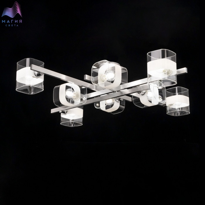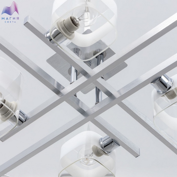 Потолочная люстра Citilux Вирта CL139280 в современном стиле. Корпус - металл, цвет - алюминий/хром. Плафоны - стекло, цвет - прозрачный/белый. Подходит для всех типов потолков, в том числе натяжных. Люстра восьмирожковая, квадратной формы, осветит около 25м².