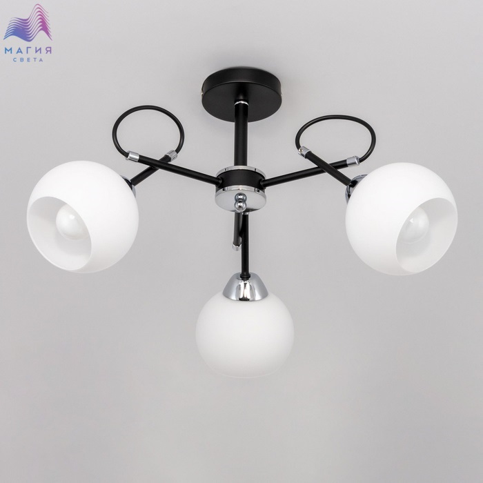 Потолочная люстра Citilux Стивен CL141231 в современном стиле. Корпус - металл, цвет - чёрный/хром. Плафоны круглой формы изготовлены из матового стекла. Подходит для всех типов потолков, в том числе натяжных, тип крепления – планка. Площадь освещения около 10м².