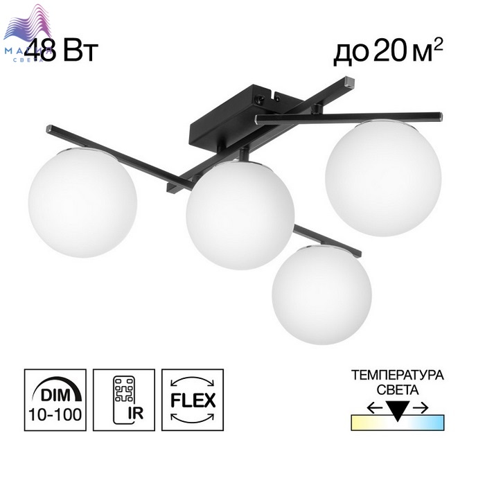 Потолочная светодиодная люстра Citilux CL223142 Dorsy. Материал: металл/полимер. Цвет: черный/белый. Четыре плафона в форме шаров из матового оптического полимера. Поворотные рожки позволят придать модели различные формы. Пульт ДУ в комплекте (регулировка яркости от 10 до 100%, цветовая температура от 3000 до 5500К).