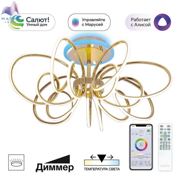Серия потолочных люстр Citilux Salma. Металлический корпус. Цвет: золото или хром. Рассеиватели из оптического силикона. RGB модель потолочной подсветки можно включать совместно с основным светом или отдельно. Управлять можно черз пульт ДУ, смартфон, умную колонку, настенным выключателем.