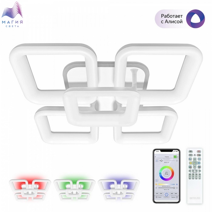 Потолочная люстра Citilux Паркер Смарт CL225A250E RGB с голосовым управлением. Светильник белый матовый, с квадратным основанием. Люстра оснащена пятью светодиодными модулями-плафонами. Корпус плафонов белого цвета изготовлен из ударопрочного полимера, рассеиватель белый матовый из оптического полимера. Люстрой можно управлять: из приложения на смартфоне по Wi-Fi при наличии интернета, с помощью голосовых помощников Алиса и Маруся, есть возможность запуска настроенных сценариев с помощью Сири, а также пультом дистанционного управления и с настенного выключателя. Модель оснащена мощными светодиодами, с возможностью плавной регулировки яркости от 10 до 100%. Цветовая температура регулируется в диапазоне от 3000К до 5500К, позволяя настроить любые оттенки теплого, нейтрального или холодного света. В основании светильника установлена независимая цветная подсветка RGB.