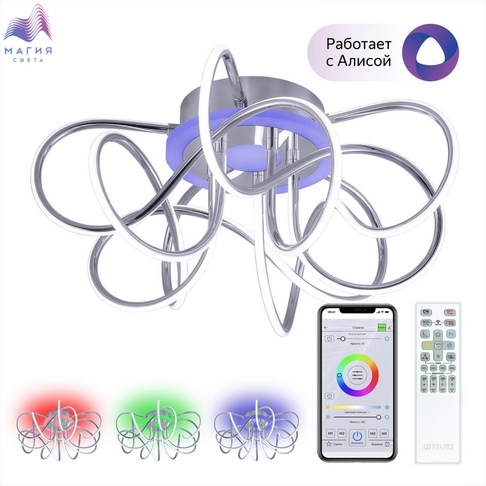 Потолочная люстра Citilux Джемини Смарт CL229A151E RGB с голосовым управлением. Круглое основание и узогнутые рожки. Корпус - металл, цвет - хром. Рассеиватель - полимер, цвет - белый. Люстрой можно управлять: из приложения на смартфоне по Wi-Fi, с помощью голосовых помощников Алиса и Маруся, Сири, а также пультом ДУ и с настенного выключателя. Плавная регулировка яркости (от 100% до 10%) и цвета свечения (от 3000К до 5500К). Независимая цветная RGB подсветка.