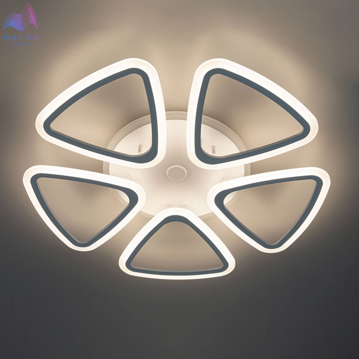 Люстра Citilux Мальта Смарт CL234A250E RGB с голосовым управлением. Круглое основание. Цвет - белый. 5 плафонов треугольной формы. Корпус - металл, рассеиватель - полимер белого цвета. Люстрой можно управлять: из приложения на смартфоне по Wi-Fi, с помощью голосовых помощников Алиса и Маруся, Сири, а также пультом ДУ и с настенного выключателя. Плавная регулировка яркости (от 100 до 10%) и цвета свечения (от 3000К до 5500К). Независимая цветная RGB подсветка.