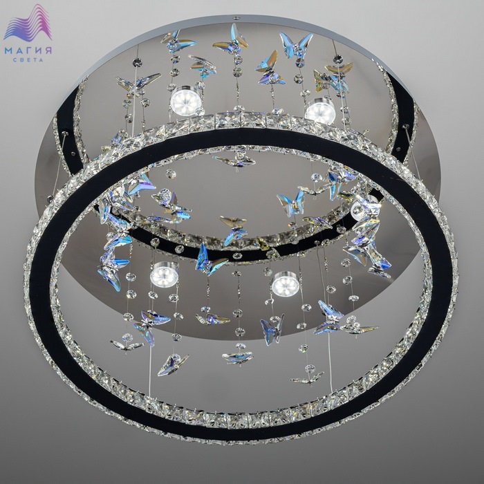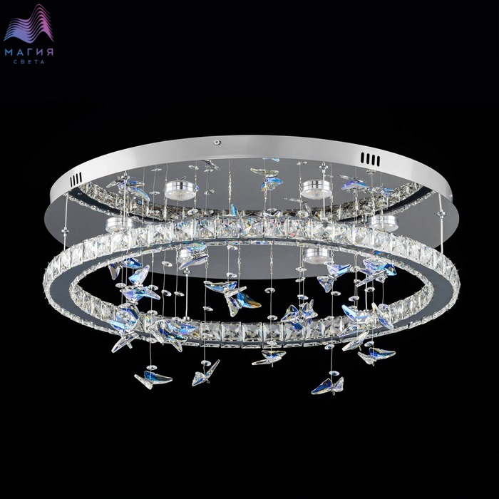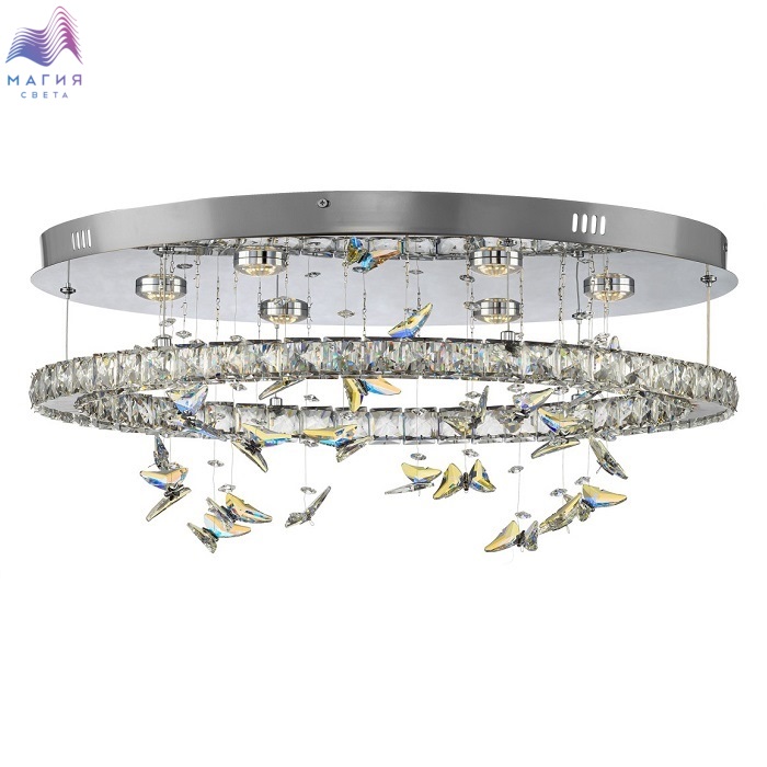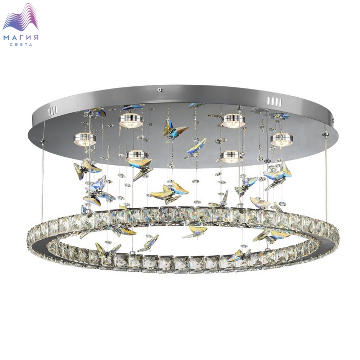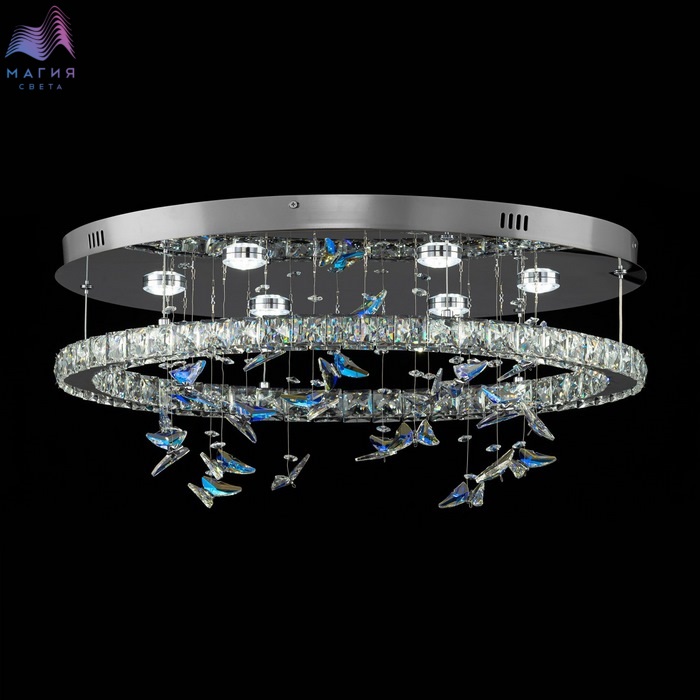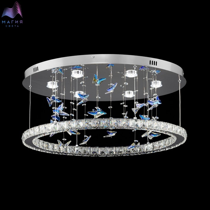 Светодиодная потолочная люстра Citilux ETERA CL322050. Материал: металл/хрусталь. Цвет: хром/прозрачный/синий. Светодиодное кольцо-плафон огранено прозрачным хрусталем, дополнено изящными подвесками в форме бабочек отливают глубокой синевой. Пульт ДУ (плавная смена яркости от мягкого свечения (10%) до яркого дневного света (100%), выберите оттенок — от тёплого золотистого (3000K) до холодного кристально-белого (5500K).