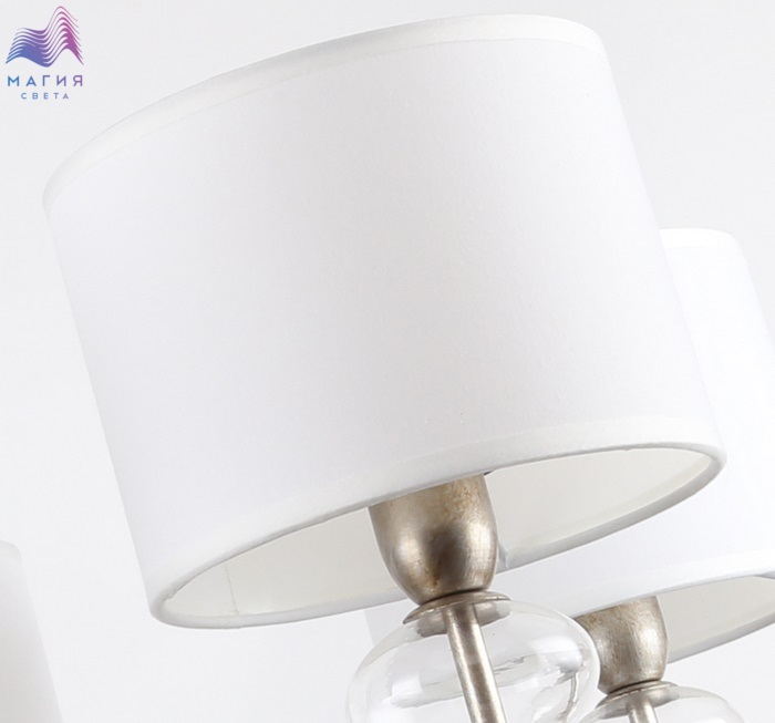 Модная коллекция Favourite Ironia исполнена в цвете "античное серебро". Люстры оснащены штоком, с помощью чего регулируется высота светильника. В основе декора лежат стеклянные элементы, добавляющие легкости образу светильников. Абажуры изготовлены из белой ткани.