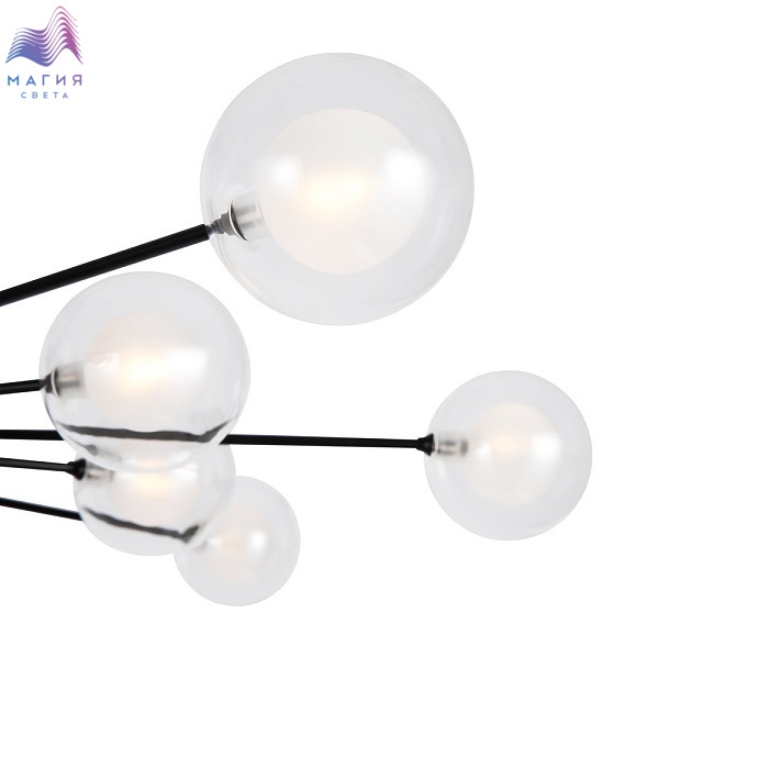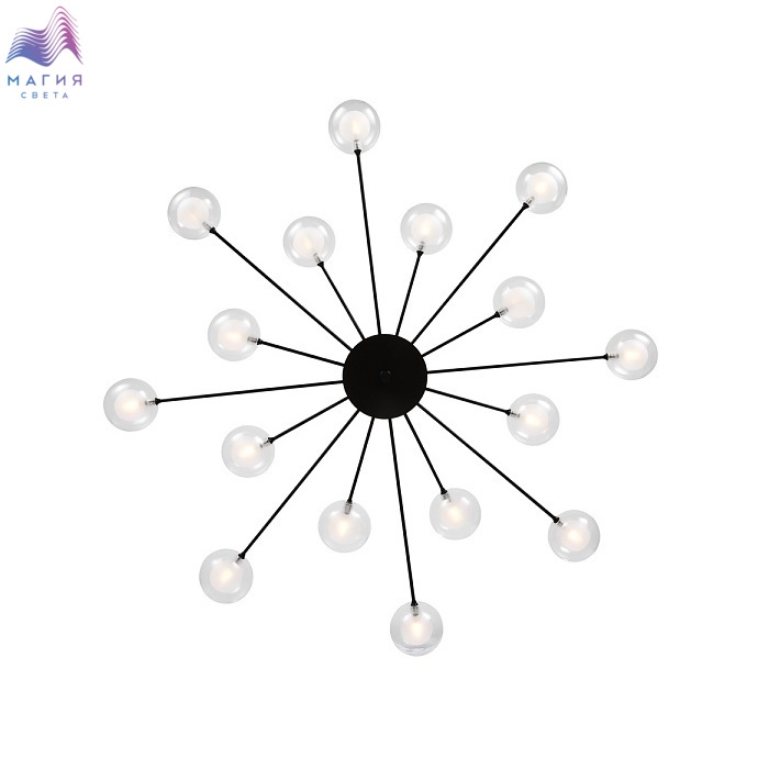 Freya Celebrity ー это изобретательное произведение искусства. Источник света представлен двумя видами плафонов: двойное стекло и акриловое стекло в сочетании с латунной металлической окантовкой. Эти маленькие огоньки раскинуты по всей площади светильника и создают ощущение, что в вашей квартире есть свое небольшое звёздное небо. Плафоны расположены на концах арматур, которые по кругу выходят из цилиндра в центре. Материал плафонов: стекло, акрил. Цвета арматуры: черный и золото.
