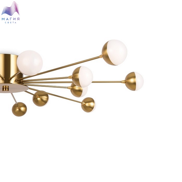 Freya Celebrity ー это изобретательное произведение искусства. Источник света представлен двумя видами плафонов: двойное стекло и акриловое стекло в сочетании с латунной металлической окантовкой. Эти маленькие огоньки раскинуты по всей площади светильника и создают ощущение, что в вашей квартире есть свое небольшое звёздное небо. Плафоны расположены на концах арматур, которые по кругу выходят из цилиндра в центре. Материал плафонов: стекло, акрил. Цвета арматуры: черный и золото.