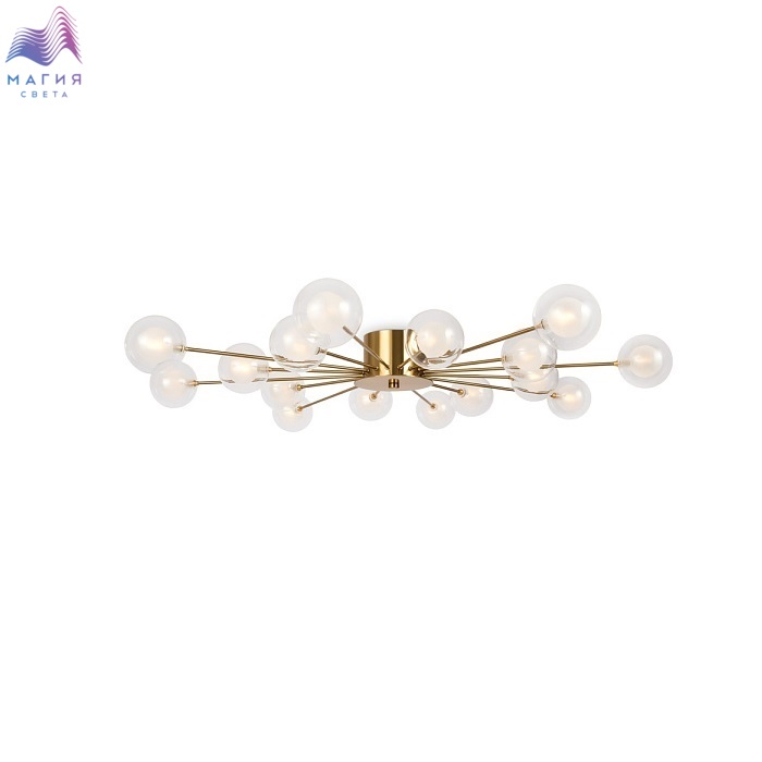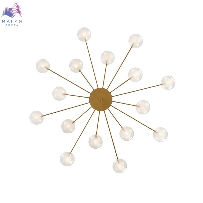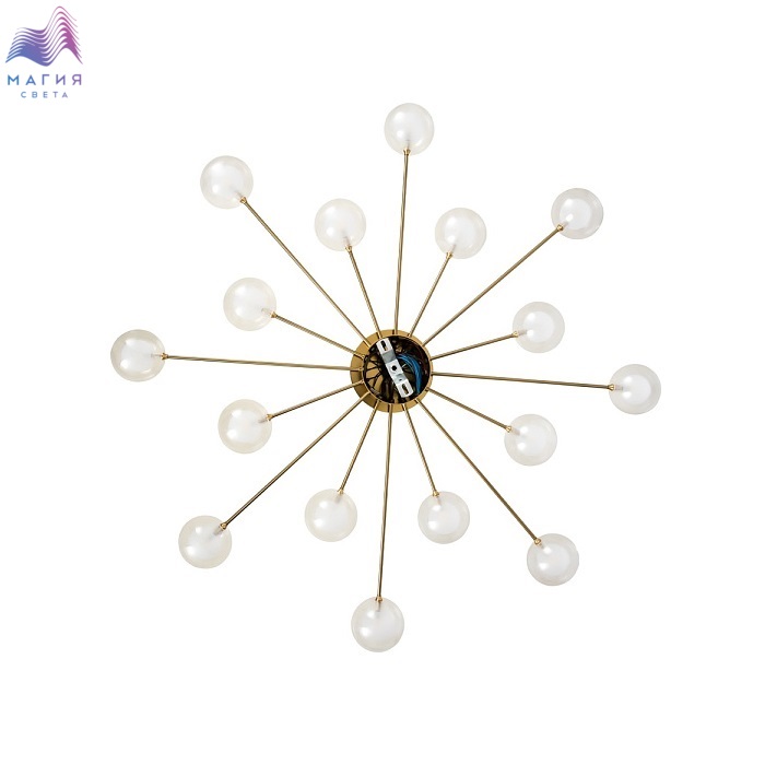 Freya Celebrity ー это изобретательное произведение искусства. Источник света представлен двумя видами плафонов: двойное стекло и акриловое стекло в сочетании с латунной металлической окантовкой. Эти маленькие огоньки раскинуты по всей площади светильника и создают ощущение, что в вашей квартире есть свое небольшое звёздное небо. Плафоны расположены на концах арматур, которые по кругу выходят из цилиндра в центре. Материал плафонов: стекло, акрил. Цвета арматуры: черный и золото.