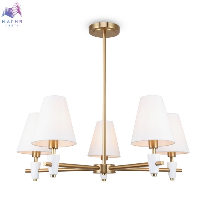 Серия Freya Pietra исполнена в цвете латунь. Дополнительные элементы - минималистичные вставки из натурального белого мрамора. Белые абажуры из ткани в форме конуса.