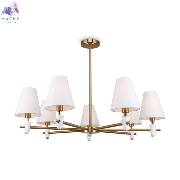 Серия Freya Pietra исполнена в цвете латунь. Дополнительные элементы - минималистичные вставки из натурального белого мрамора. Белые абажуры из ткани в форме конуса.