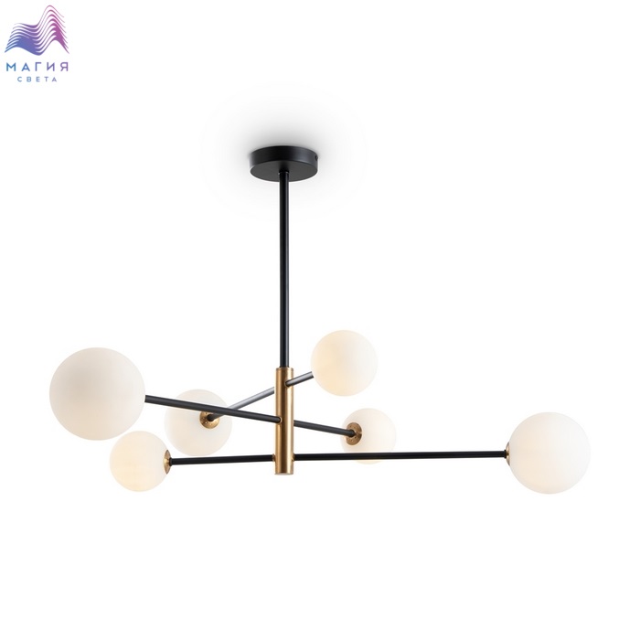Серия Freya Sphirity. Металлическая арматура покрыта черной краской с золотистыми вставками. Круглые плафоны из белого матового стекла обеспечивают мягкое заливное освещение. На корпусе бра удобная кнопка для включения. Дизайн — минималистичный Источник света — лампа с цоколем G9.