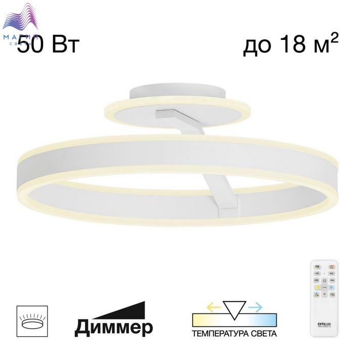 Светодиодный потолочный светильник Citilux Дуэт CL719740. Материал: металл/полимер. Цвет: матовый белый. Плафон в форме кольца. Пульт ДУ в комплекте (плавная регулировка яркости от 10 до 100%; управление цветовой температурой от 3000К до 5500К). Освещаемая площадь - до 18м².