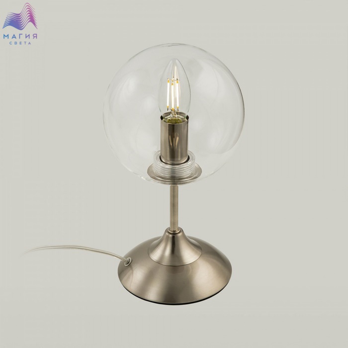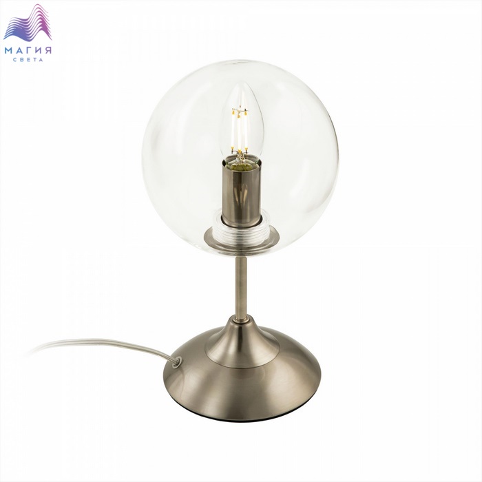 Настольная лампа CL102811 с одним плафоном. Корпус модели изготовлен из металла, цвет хром. Плафон стеклянный в форме шара, прозрачный. Сетевой провод прозрачный длиной 1,7 метра, на нем расположен выключатель на расстоянии 20 см от основания.