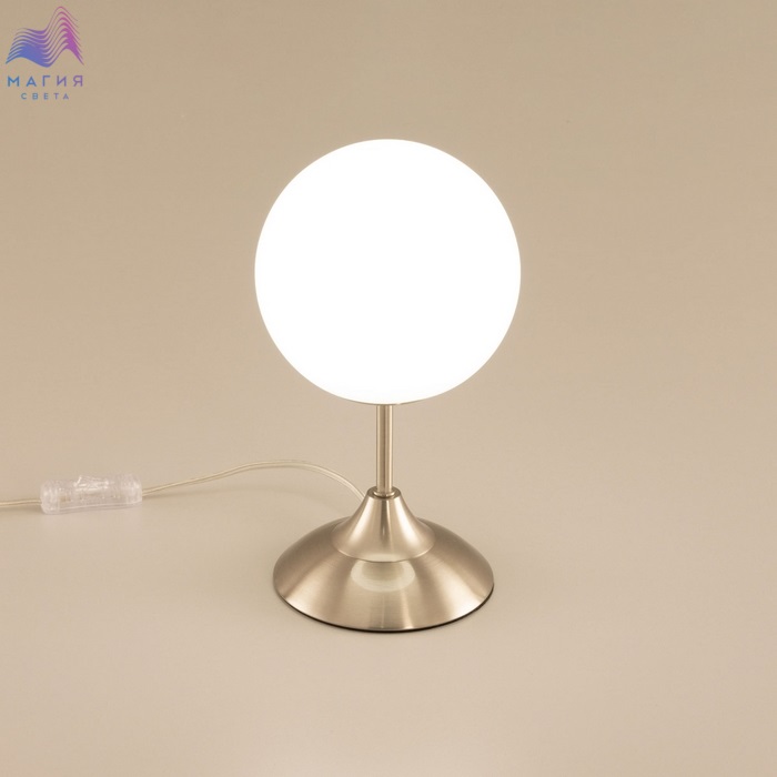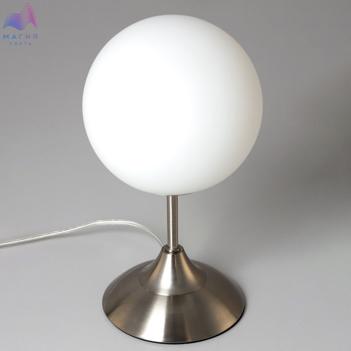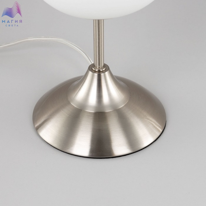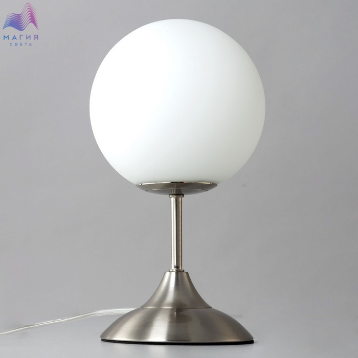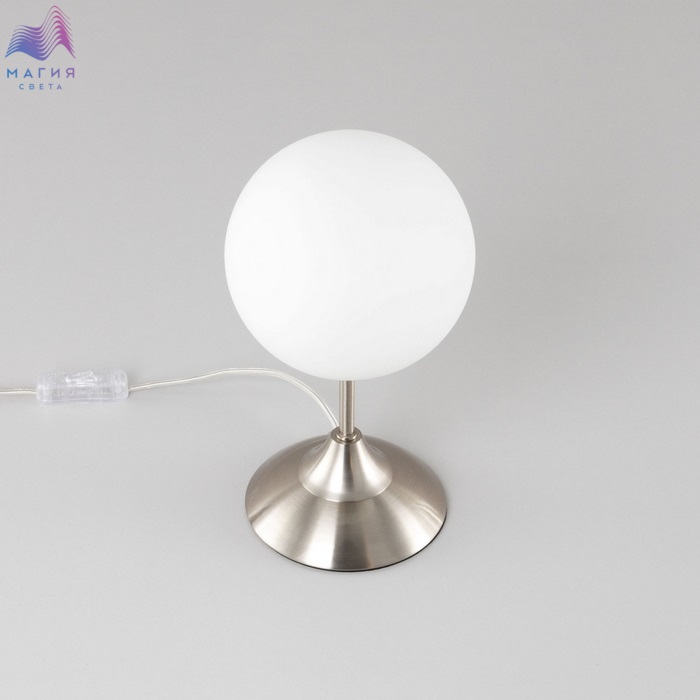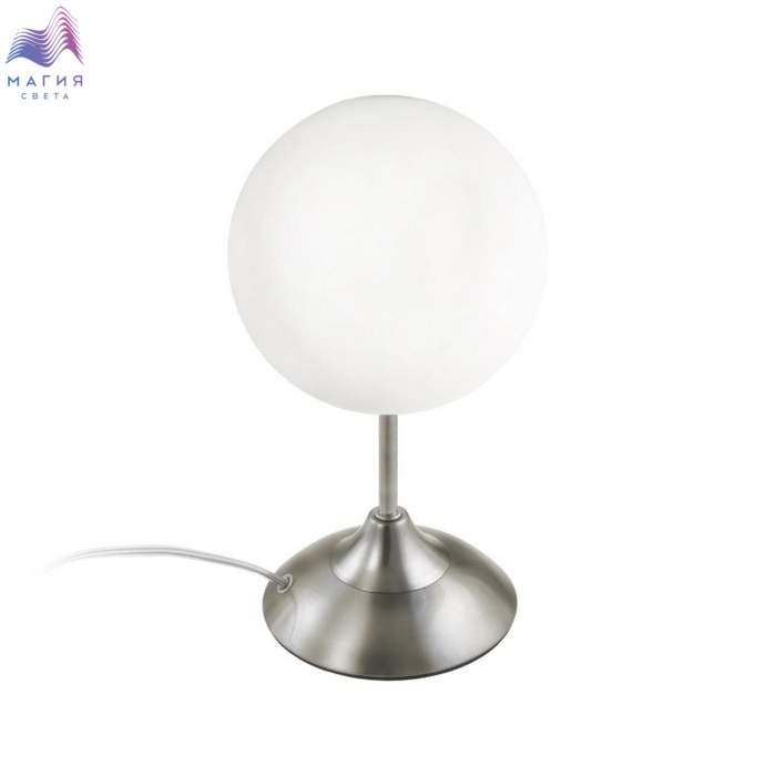 Настольная лампа CL102814. Материал: металл/стекло. Цвет: матовый хром/белый. Плафон в форме шара. Сетевой провод прозрачный длиной 1,7 метра. Выключатель расположен на проводе, на расстоянии 20 см от основания.