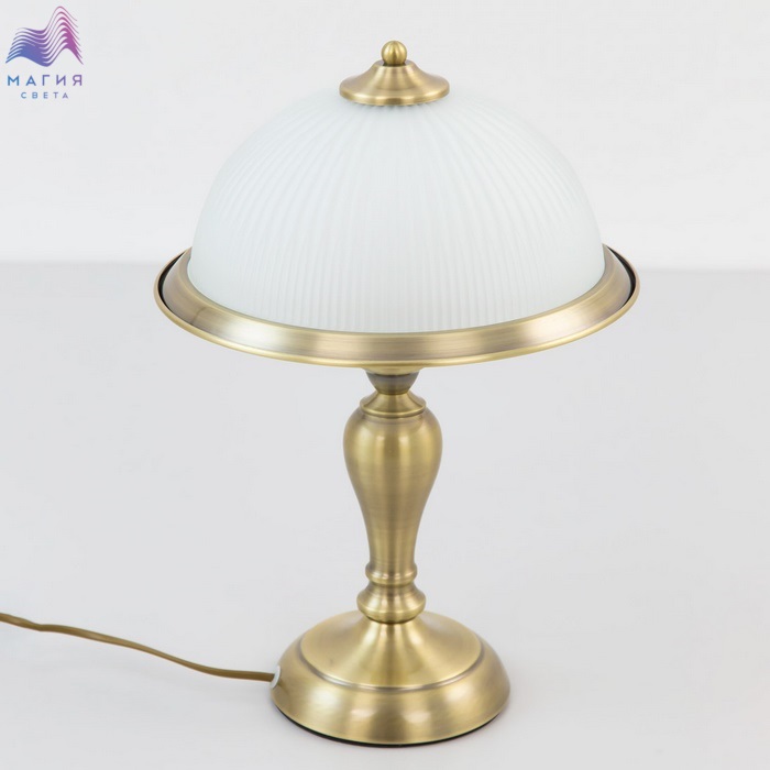 Настольная лампа Citilux Идальго CL434811 с металлическим корпусом бронзового цвета. Плафон стеклянный, полуматовый, рифленый с металлическим ободком. Выключатель находится на сетевом проводе, длина провода 1,7 метра.