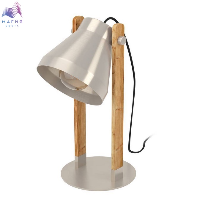Серия Eglo Cawton представлена подвесными светильниками с разным количеством плафоном, спотом, настольной лампой и торшером. К деревянному основанию прикреплены металлические плафоны стального цвета.