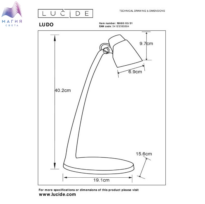 Серия настольных ламп Lucide Ludo предназначена для освещения рабочего стола. Лампы изготовлены из пластмассы. На выбор 3 цвета исполнения: черный/латунь, белый/серебро и черный. В качестве источника света используются встроенные светодиоды теплого белого цвета.