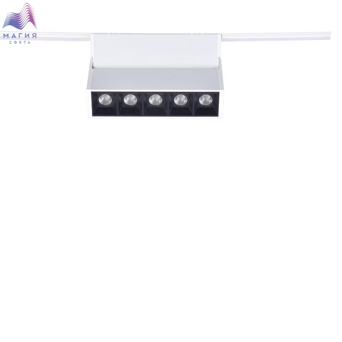 Магнитный светильник на шинопровод белого цвета с линией утопленных линз и поворотным механизмом, который позволяет менять направление светового потока.