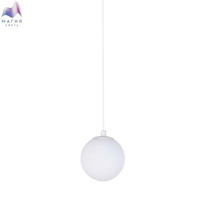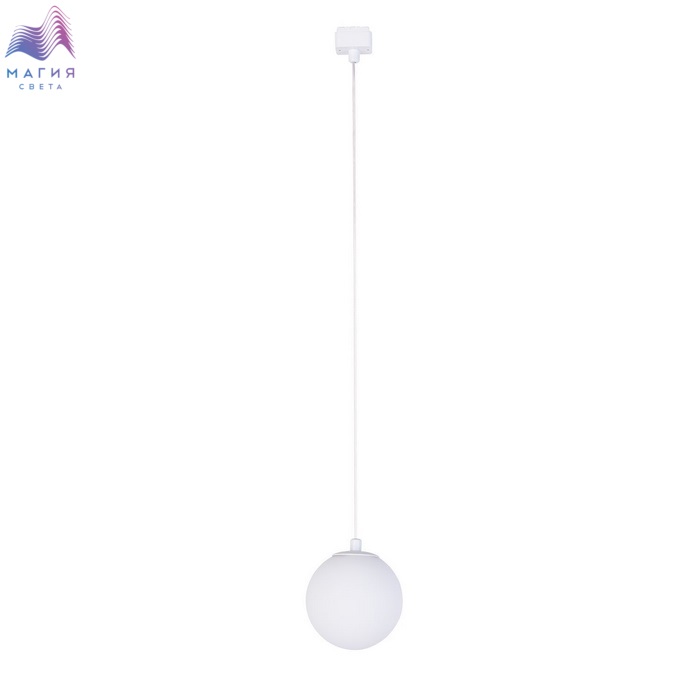 Подвесной светильник на шинопровод белого цвета с плафоном из белого выдувного стекла.