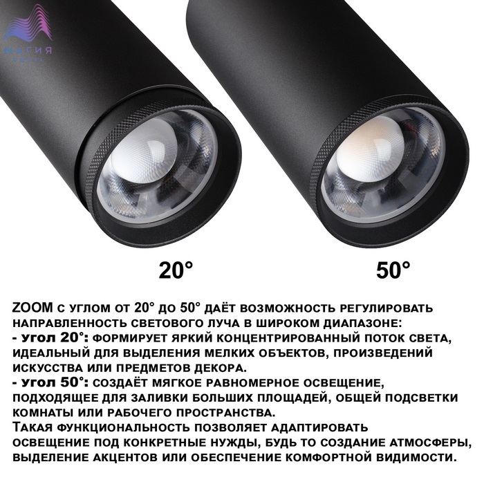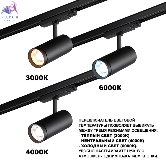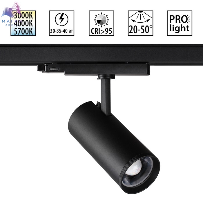 Трековый трехфазный LED-светильник Novotech NAIL. Уникальная система настроек включает смену цветовой температуры (от теплого 3000К, нейтрального 4000К до холодного белого 6000К), регулирование интенсивности света (30 Вт, 35 Вт или 40 Вт) и изменение угла рассеивания (от четких акцентирующих лучей 20° до равномерно распределенных потоков света 50°).
