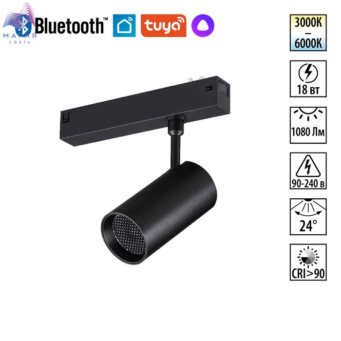 Трековая смарт-система Novotech VECTOR 220В. Система представлена двумя линейками светильников: первая оснащена интеллектуальной системой управления через мобильное приложение, позволяющей менять яркость и цветовую температуру света, вторая — светильники с простым механическим переключателем трех уровней цветовой температуры (3000, 4000, 6000 К).