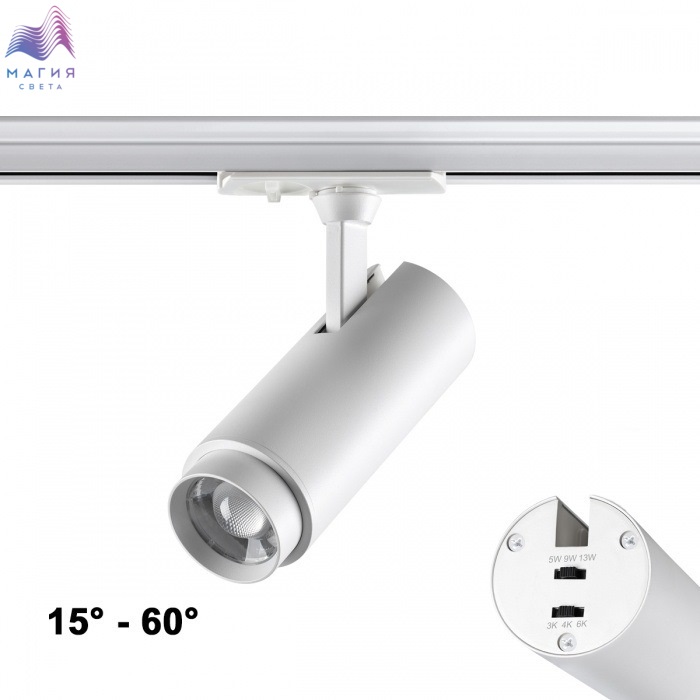 Однофазный двухжильный трековый светодиодный светильник Novotech Nail с переключателем цветовой температуры (3000К-4000К-6000К) и переключателем мощности (5Вт-9Вт-13Вт). А так же с изменяемым углом рассеивания (от 15° до 60°).